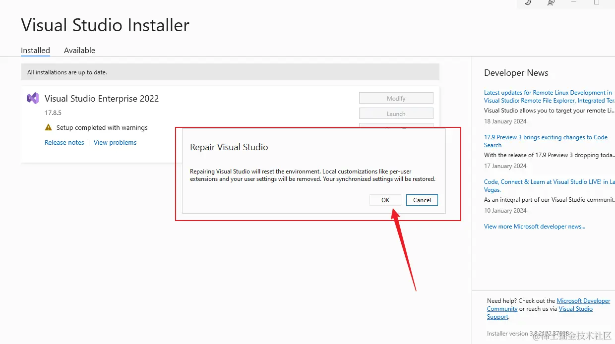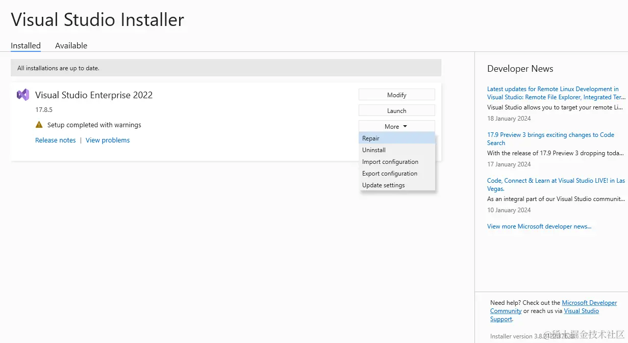 - 重新运行VS installer 界面点击:更多—修复