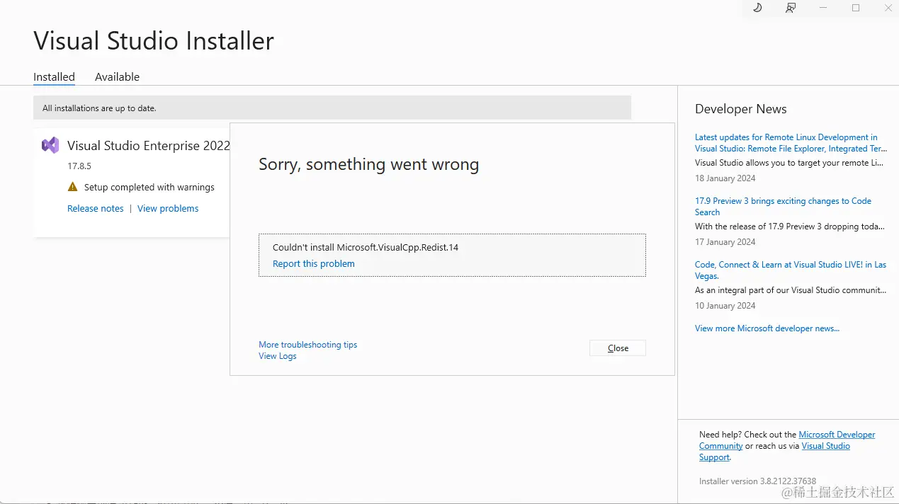 If the issue has already been reported on the Developer Community, you can find solutions or workarounds there. If the issue has not been reported, we encourage you to create a new issue so that other developers will be able to find solutions or workarounds. You can create a new issue from within the Visual Studio Installer in the upper-right hand corner using the "Provide feedback" button.