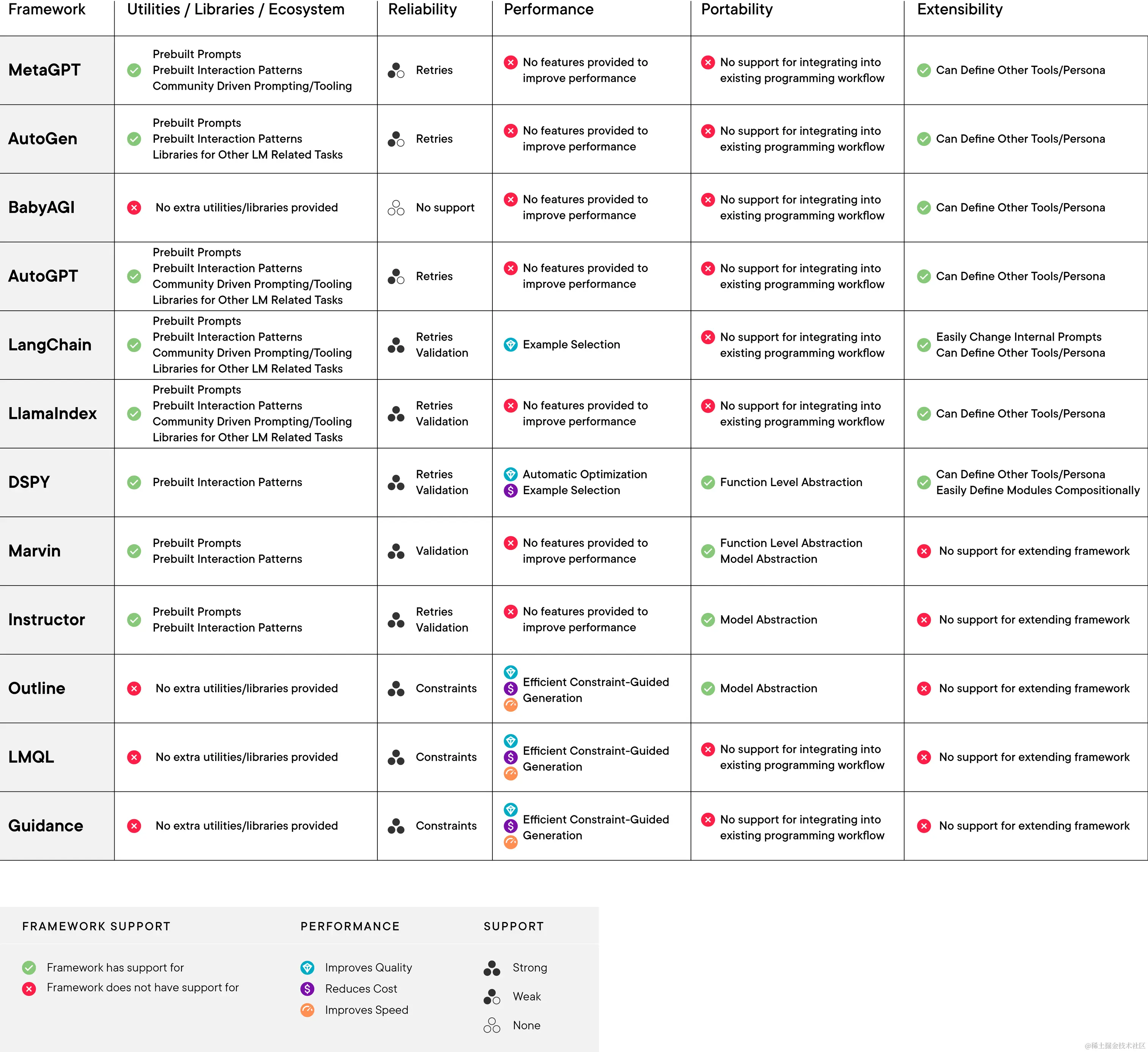 近月来,LLM 编程抽象领域有了显著进展,催生了许多流行的框架。我们提出了一个 7 层抽象模型来分类这些库,并概述了我们观察到的关注点的分离。接下来,我们从内在和外在特征的角度探讨了五大类框架。它们的内在特征包括易于扩展性、保证输出稳定性的功能,以及如何与其他库和框架互动。而外在特征则涉及社区和生态系统方面,如可复用的提示策略,或基于框架开发的用于更专业任务的库。为了全面展示这些最新框架,我们在表 3 中列出了它们的工具/库/生态系统、可靠性、性能、可移植性和可扩展性,并在图 2 中进一步解释了表中的一些术语。