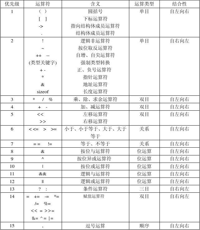 下面是各种操作符的优先级与结合性