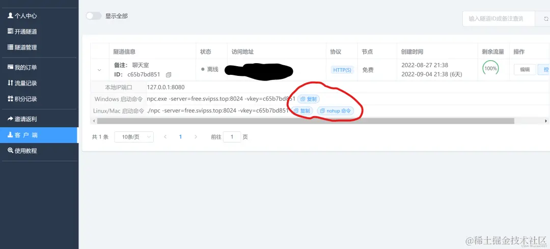 点击此链接根据电脑系统下载客户端。下载完后解压,一共有两个文件:傻瓜式运行点击我. vbs 和 npc.exe。点击傻瓜式运行点击我. vbs,打开后会看见一个弹窗,让你填写指令。我们切回飞鸽官网,点击 “隧道管理”,如下图:根据电脑系统选择指令,点击复制,然后切回刚才的弹窗,将指令输入进去,点击确定。