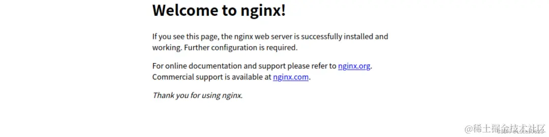 配置完 Nginx 后,返回 Nginx 根目录,找到 nginx.exe,双击运行它,你会看到有个小黑框一闪而过,这说明 Nginx 已经成功启动!你可以打开浏览器,输入:虚拟主机名称: 监听的端口(刚刚的配置),回车,就会看到如下网页: