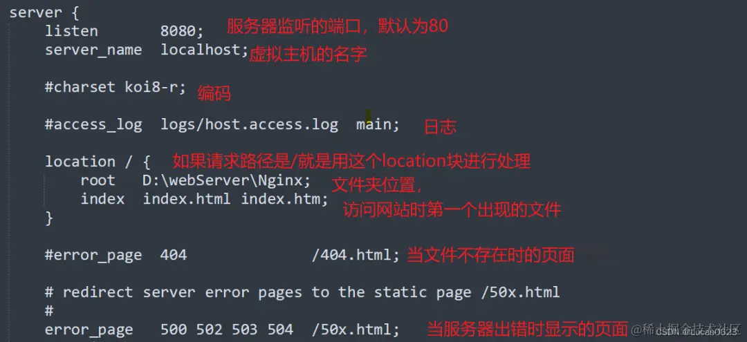 进入 conf 文件夹,打开 nginx.conf 文件进行编辑,里面的配置很多,我对其中一些重要的配置进行了说明(前面有#的表示并没有真正写入配置,若要加入,只需去掉#)