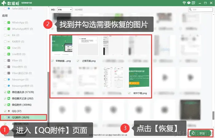 步骤4:在扫描结果中,点击**【QQ附件】找到并选择要恢复的QQ图片。最后点击【恢复】**按钮,选择一个合适的存储路径,将图片保存到电脑上就可以了。