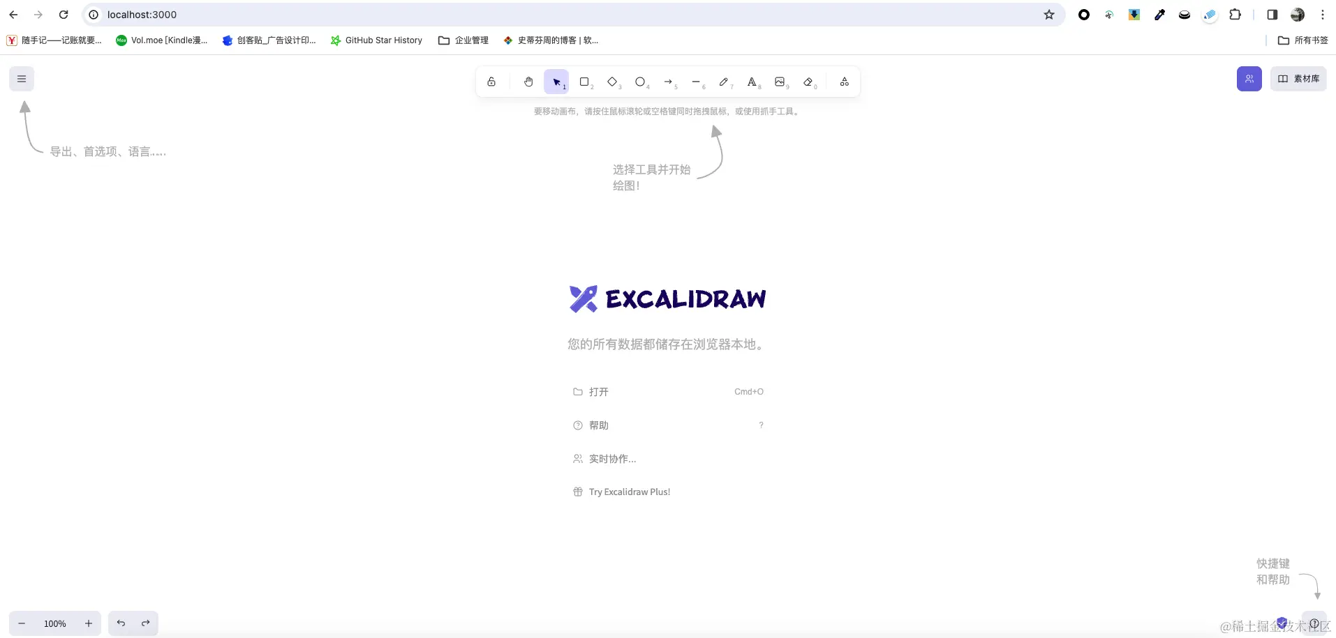 首先Excalidraw还提供了在线的环境方便用户快速上手,地址如下:excalidraw.com/