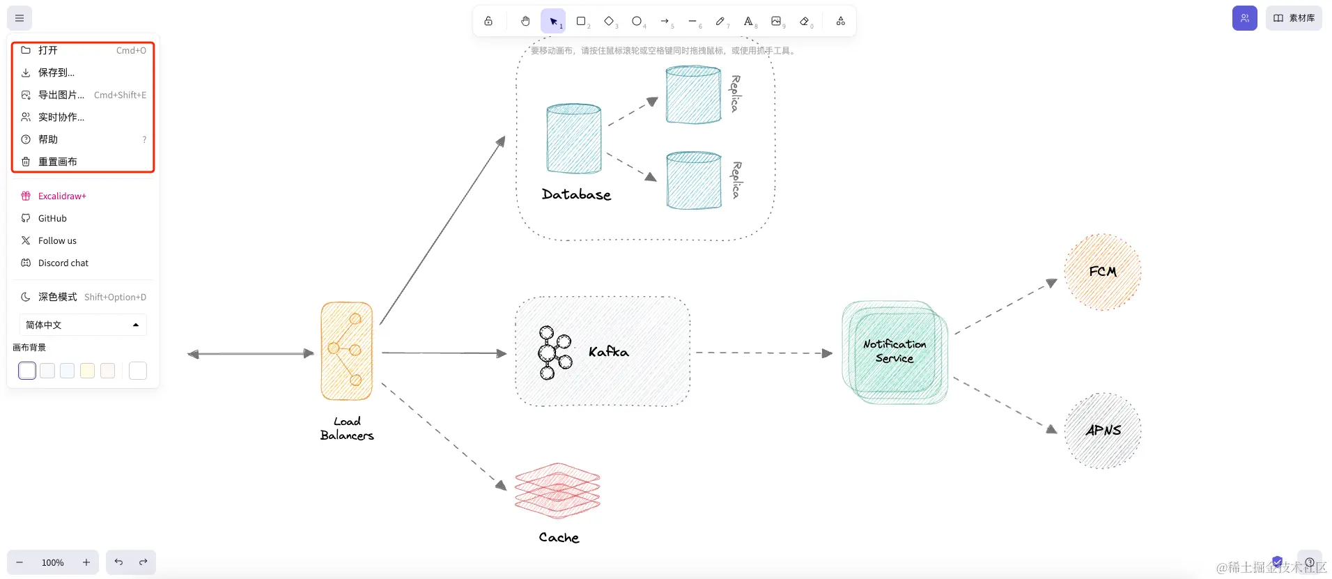 Excalidraw是一个虚拟白板应用,专门用于绘制类似手绘的图表。它提供了一个无限的、基于画布的白板,具有手绘风格,支持多种功能。