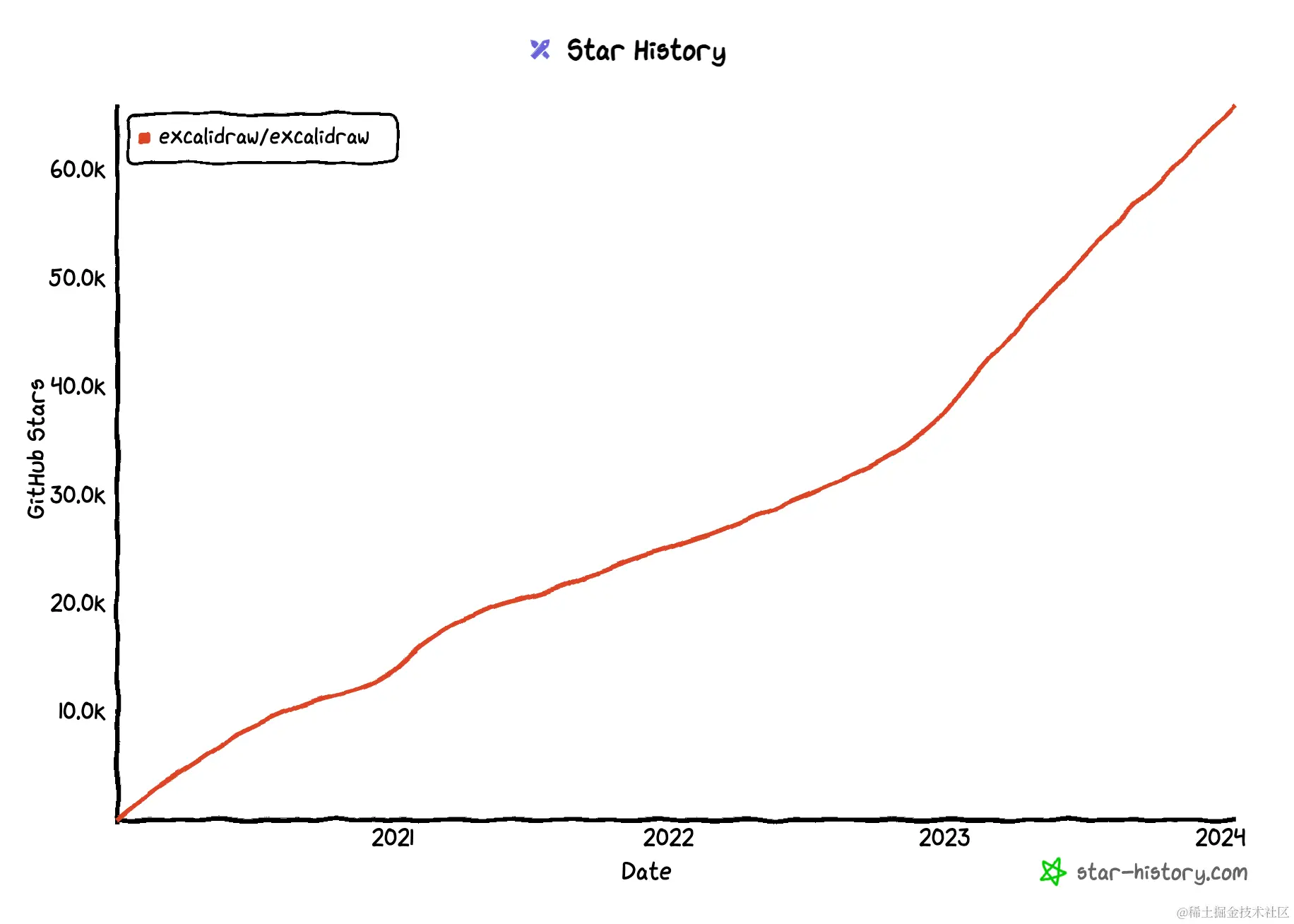 下面是它的GitHub star历史,Excalidraw 在绘图工具圈里起步算是比较晚的,但是可以看出发展还是非常快的。