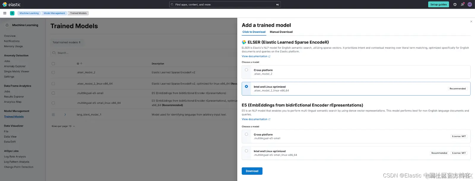 在 Elastic Search 8.12 中,只需简单下载或单击按钮即可快速完成使用 Elastic 平台管理 E5 模型的操作。 选择在 Elastic 中管理此模型使用户能够从特定于平台的优化中受益,从而获得更好的搜索体验性能。