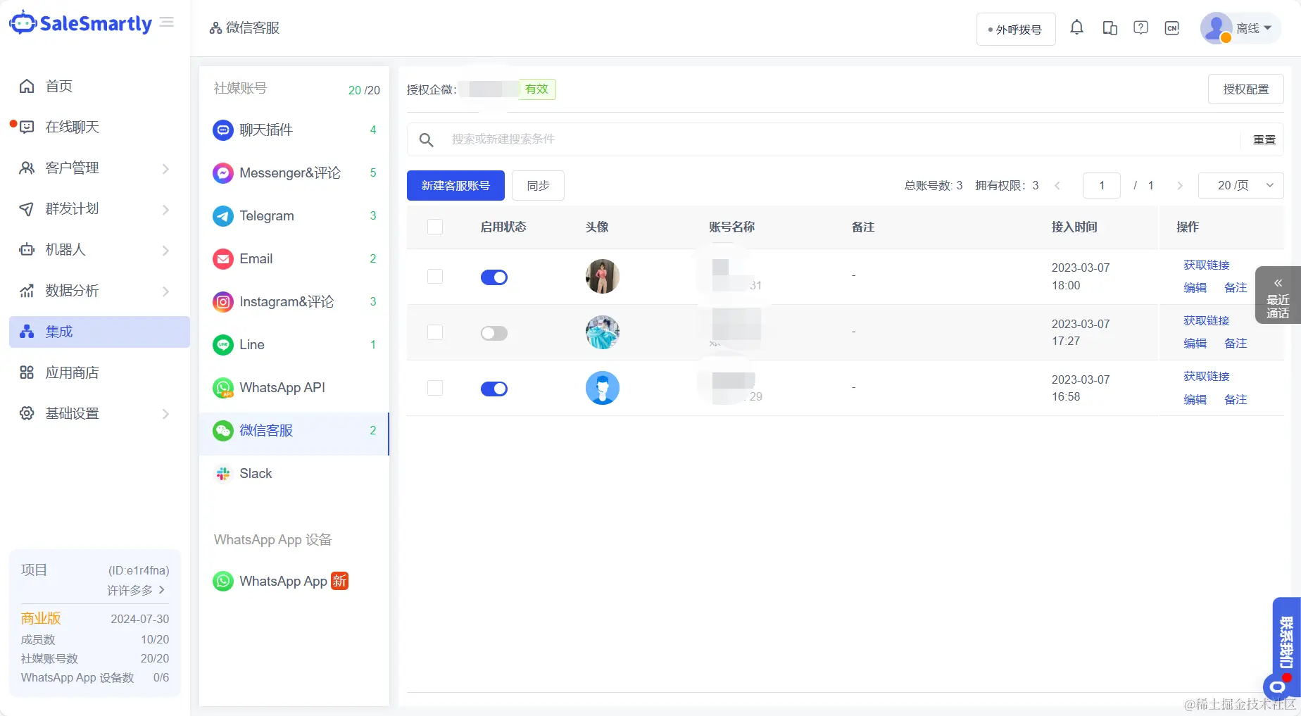 1.管理和维护客户关系。通过企业微信来添加和管理你的客户,给他们群发消息、朋友圈、小程序等,也可以用群活码邀请他们加入你的群聊,提高转化和留存。你还可以用数据统计功能查看你的客户活跃度、互动情况、删除或拉黑率等,优化你的运营策略。如果多位员工需要共用同一个企业微信接待客户时,可以把企业微信集成到SaleSmartly中,然后【新建客服账号】即可多个人同时接待。