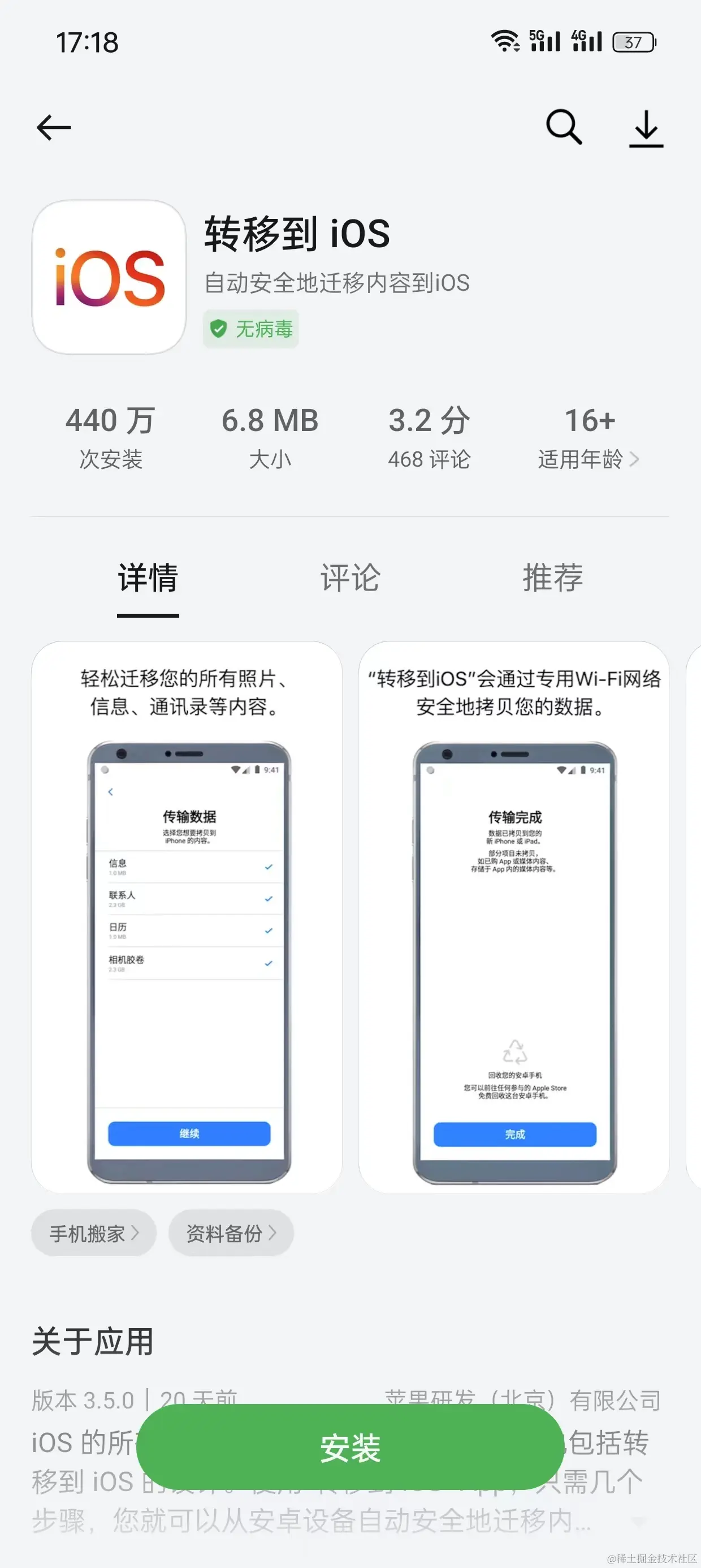 1.在安卓手机中下载一个【转移到iOS】的App,根据系统操作。