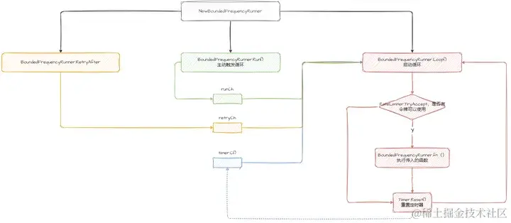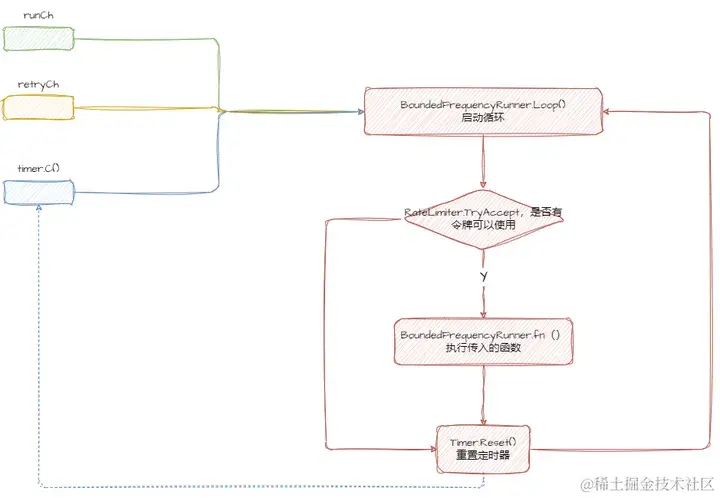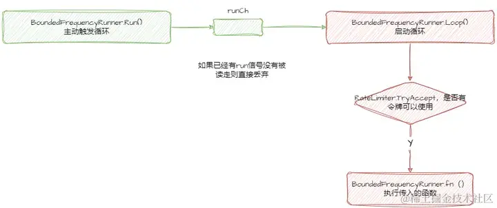 Loop循环不断监听run和timer的信号量。- 获取信号量后尝试执行逻辑,如果限流器没有token则不执行