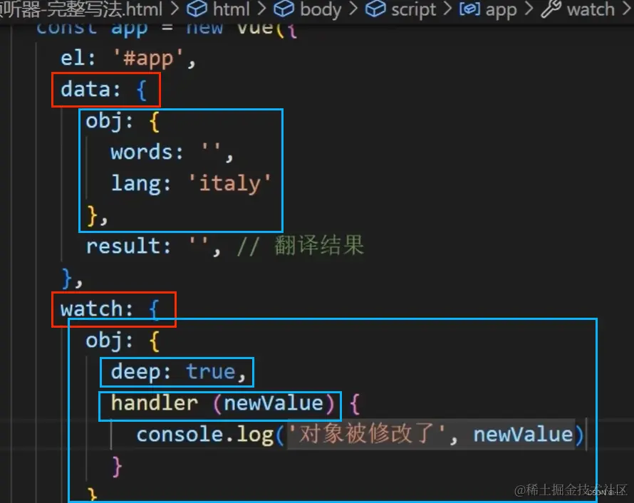 - 如果需要监视一个子属性,在watch里打点的时候就必须用引号括住