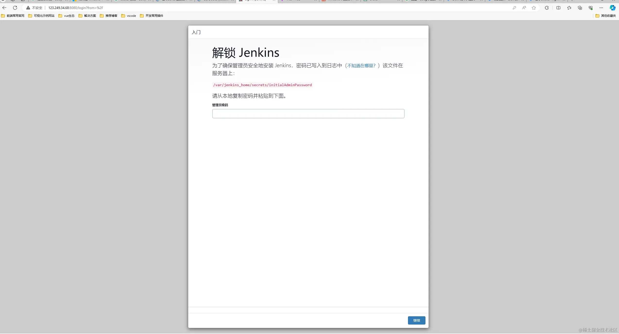 4.2启动后会看到如下界面 其他密码在你刚才 /webhook/jenkins/secrets/initialAdminPassword