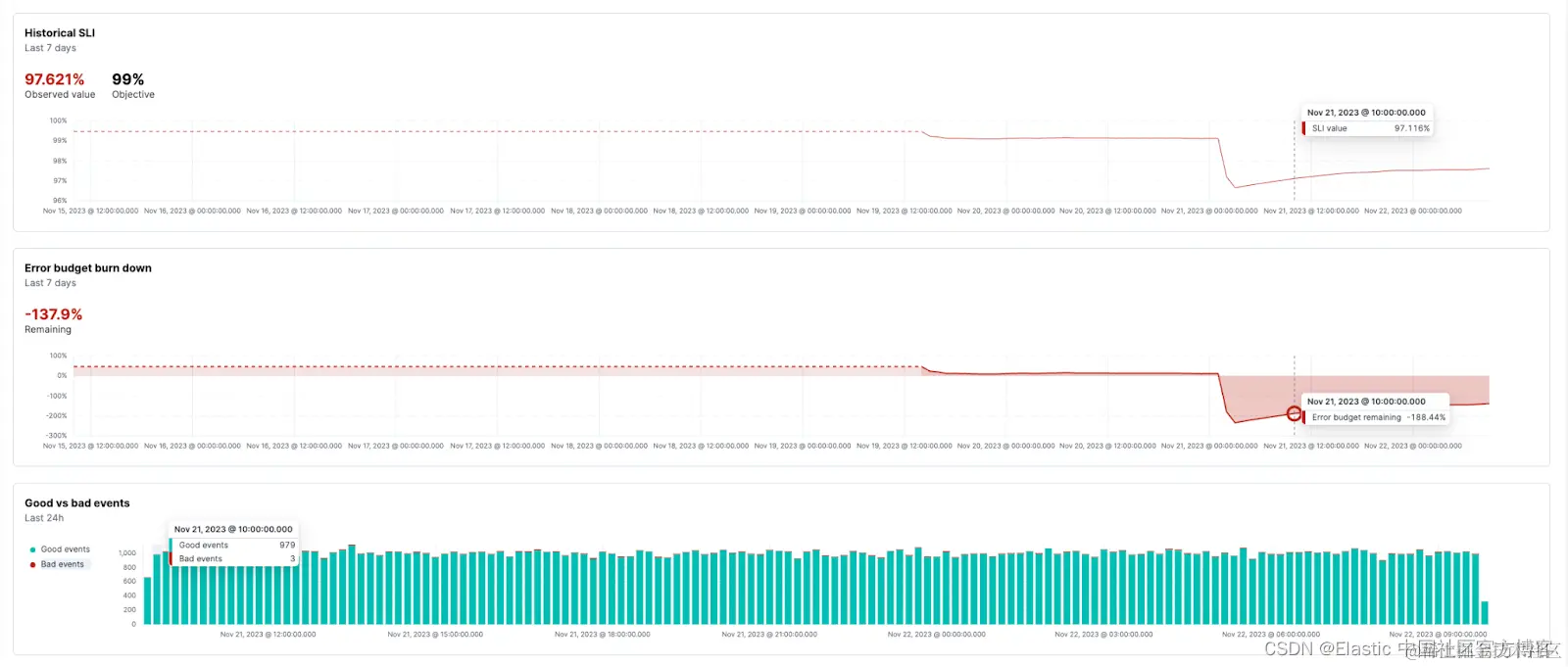 SLO 详细信息页面上有一个新图表,显示过去 24 小时内发生的好事件与坏事件,以便在违反 SLO 时更快地进行调查。