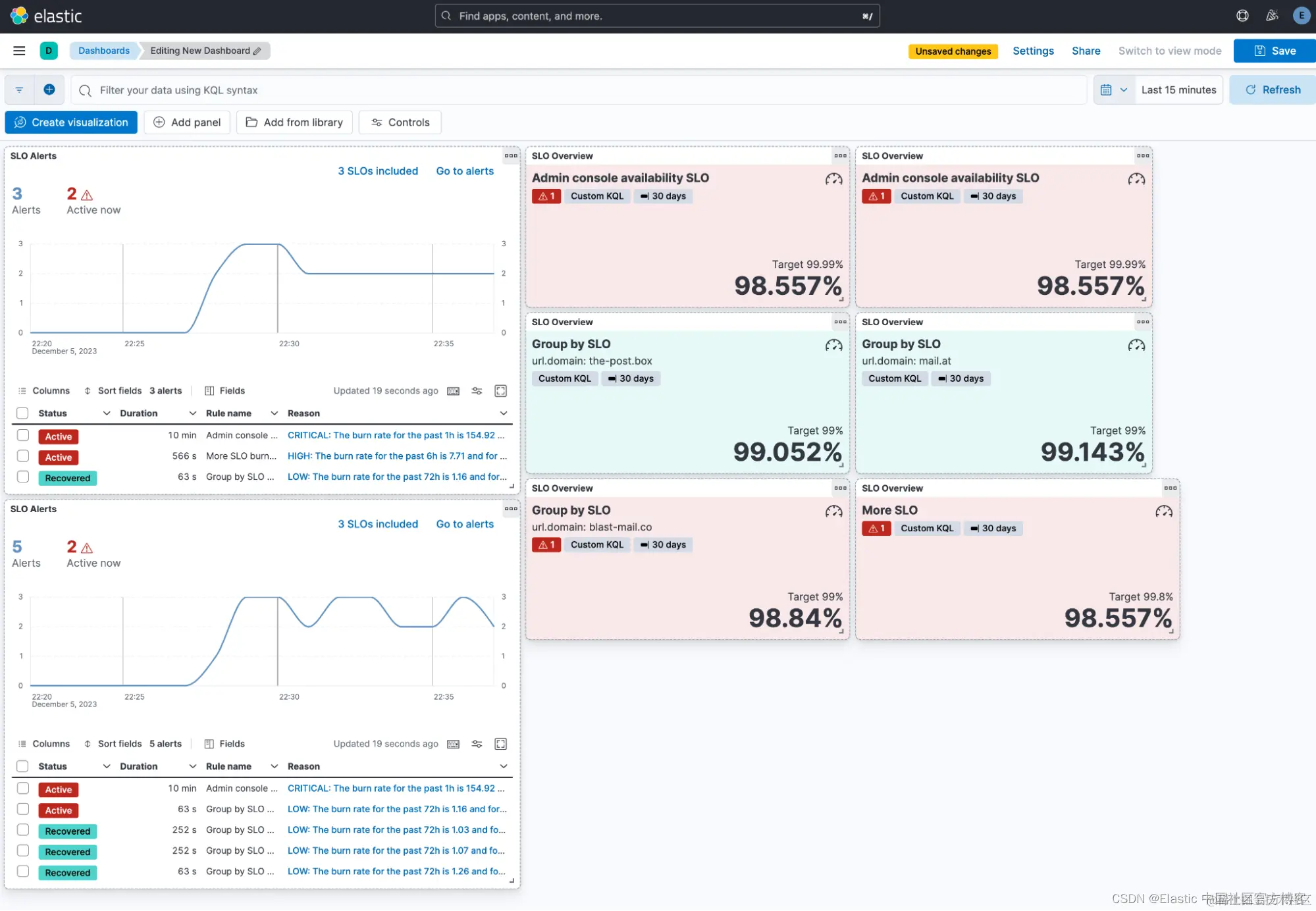 我们知道许多用户喜欢将他们的 SLO 概述可视化添加到他们的自定义仪表板中。 现在,可以更轻松地在 SLO 详细信息页面中添加 SLO 概述,但你还可以添加警报可视化来查看与仪表板中的特定 SLO 相关的任何消耗率 (burn rate) 警报。 如果用户想要查看其 SLO 警报的摘要和列表,可以添加新的 SLO 警报小部件。 他们可以选择多个 SLO、编辑配置以及与警报小部件交互。