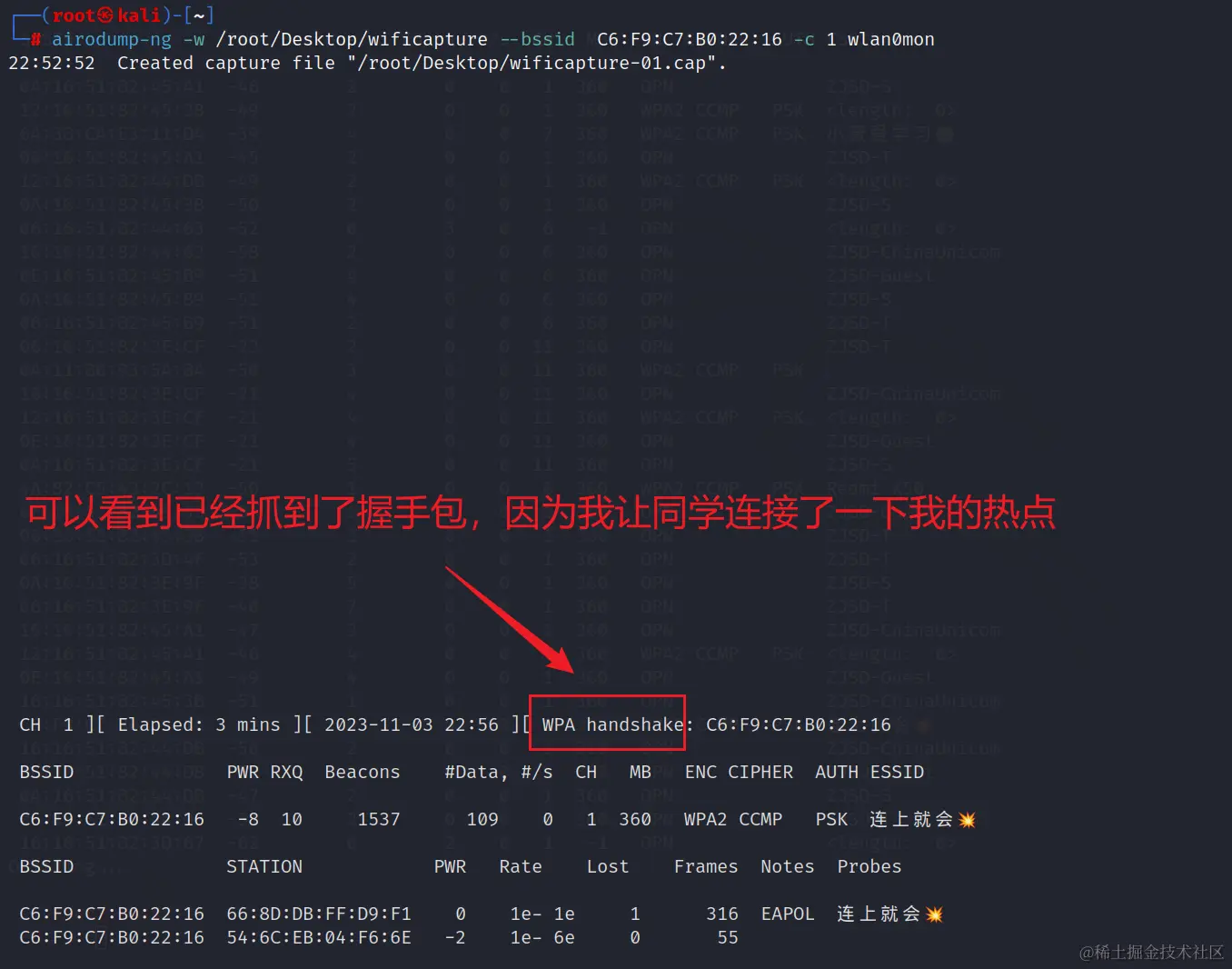 看到想要渗透的WIFI之后,ctrl+c结束扫描。