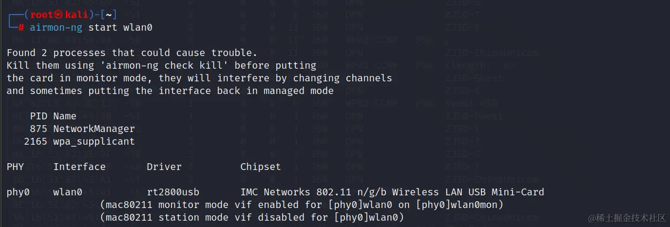 使用airmon-ng start wlan0命令,开启监听模式(前提是你的无线网卡支持监听),也就是启动了我们的无线网卡。