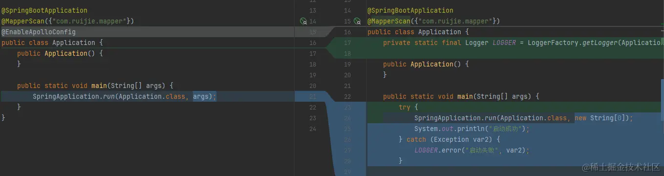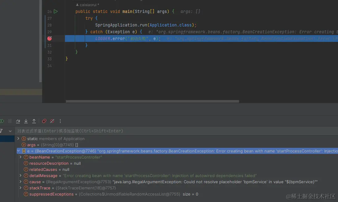拉下来之后启动也是啥错误没有,一般可以选择修改代码如右侧,trycatch一下启动方法,debug一下看下报错。根据错误类型发现是配置类少东西,和同事描述不一致,直接修改后启动成功。