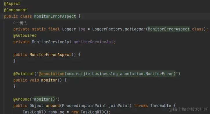 再结合代码,说明@Autowired引入的是一个代理对象,也就变相说明HttpFailSchedule有需要被代理进行处理的代码,说人话就是可能有切面,顺着代码中的@MonitorError("ptm-dashboard")注解,找到如上切面。
