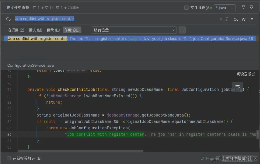 在Idea上下载了依赖的中间件源码后,打开全局搜索选择作用域后输入Job conflict with register center,跳转对应源码位置。上面这里报错的地方是一个判断,判断当前JobClassName和当时注册的原始名称是否相同,为了查找这个入参newJobClassName的由来,一路向上查传入引用方法。