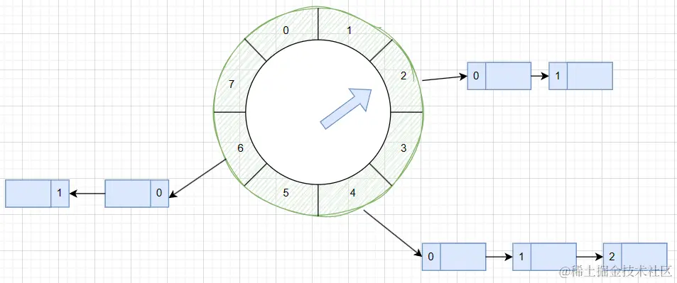 时间轮是一种机制,首次出现在论文《Hashed and Hierarchical Timing Wheels》中,简化了分布式定时器的实现。它是由多个格子组成,每个格子对应一个时间点,指针周期性的指向时间轮上的格子。当指针指向某一个格子时,时间轮会查找格子上维护的过期任务链表,然后执行所有任务。当前格子中的任务全部执行完成后,指针再指向下一个格子并且重复上述过程。