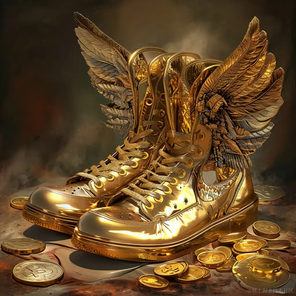 这双鞋有金色的翅膀和硬币,采用数字艺术奇观风格,富有爱国主义色彩,硬边画家风格,动态插图,Yombe艺术,插图广告。