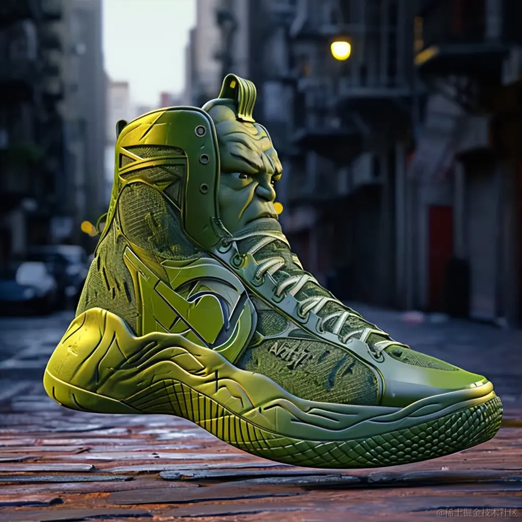 一双复仇者联盟篮球运动鞋,带有绿巨人,采用照片级写实渲染风格,32k超高清,超现实卡通,原始材料,绿色,Kimoicore,铜朋克。