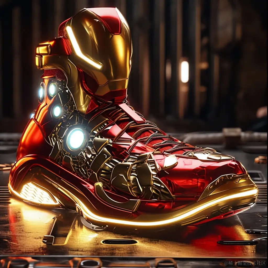 接着,钢铁侠的光亮运动鞋以深红与金色相间的色彩呈现,揭示了数字绘画在表现光影效果上的卓越之处。这种绘画风格中融入的游戏核心元素,使这双鞋更显得高科技感十足。