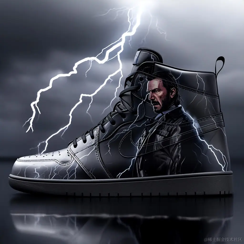 印有约翰·威克:第4章标志的运动鞋,设计了闪电形状,采用DC风格,Oleg Shuplyak,逼真描绘日常生活,钢铁朋克,黑色和灰色,技术奇迹。