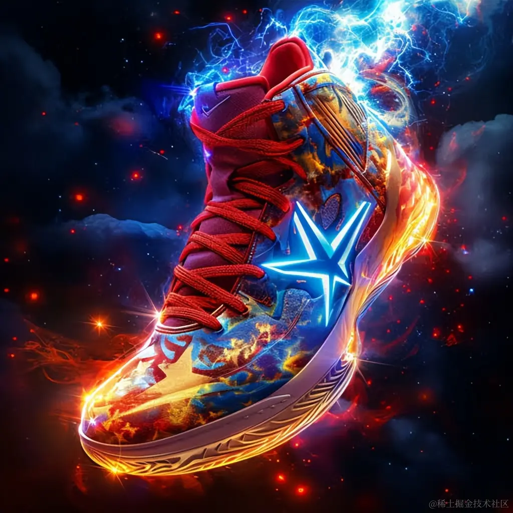 惊人设计之一是一双篮球鞋,顶部有红蓝星,采用光线追踪风格,黄金时代插画,漫威漫画,丰富多彩的爆炸效果,极光朋克,获奖者,用Provia拍摄的照片。