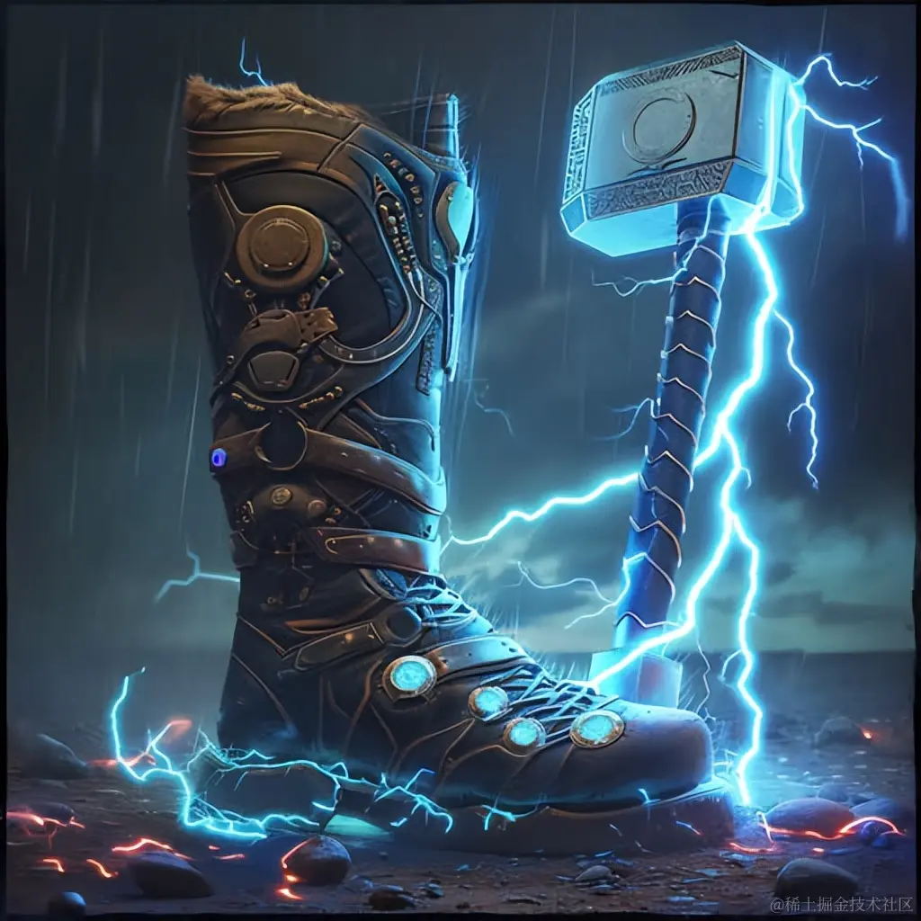 雷神之一的靴子由闪电制成,配有雷神的盾牌和锤子,以超现实的插画风格呈现,机智而聪明的卡通,机械设计,32k超高清,幻想插画,刮刀技法,分割的图标。