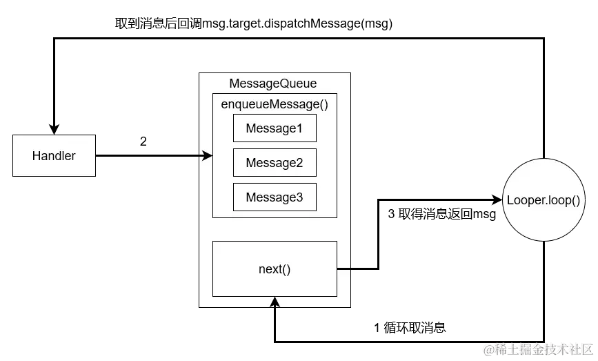 当获取到消息时,回调用 msg.target.dispatchMessage(msg) 即 handler#dispatchMessage(msg),在 dispatchMessage(msg) 中再回调 handleMessage(msg),这样就收到消息。至此发消息、收消息整个流程结束。