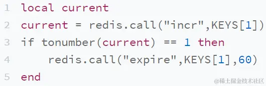 在这个例子中,已经使用了 INCR 来原子性地增加计数。但是,客户端限流的逻辑不只有计数,还包括访问次数判断和过期时间设置。 对于这些操作,同样需要保证它们的原子性。否则,如果客户端使用多线程访问,访问次数初始值为 0,第一个线程执行了 INCR(ip) 操作后,第二个线程紧接着也执行了 INCR(ip),此时,ip 对应的访问次数就被增加到了 2,就无法再对这个 ip 设置过期时间了。这样就会导致,这个 ip 对应的客户端访问次数达到 20 次之后,就无法再进行访问了。即使过了 60s,也不能再继续访问,显然不符合业务要求。所以,这个例子中的操作无法用 Redis 单个命令来实现,此时,就可以使用 Lua 脚本来保证并发控制。可以把访问次数加 1、判断访问次数是否为 1,以及设置过期时间这三个操作写入一个 Lua 脚本,如下所示:
