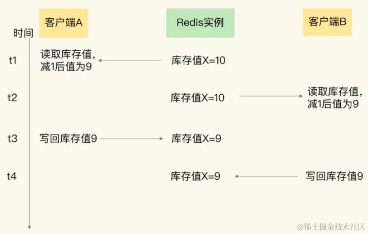 客户端 A 在 t1 时读取库存值 10 并扣减 1,在 t2 时,客户端 A 还没有把扣减后的库存值 9 写回 Redis,而此时,客户端 B 读到库存值 10,也扣减了 1,B 记录的库存值也为 9 了。等到 t3 时,A 往 Redis 写回了库存值 9,到 t4 时,B 也写回了库存值 9。 如果按正确的逻辑处理,客户端 A 和 B 对库存值各做了一次扣减,库存值应该为 8;这里的库存值明显更新错了。