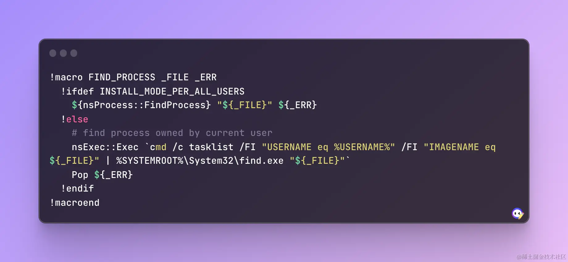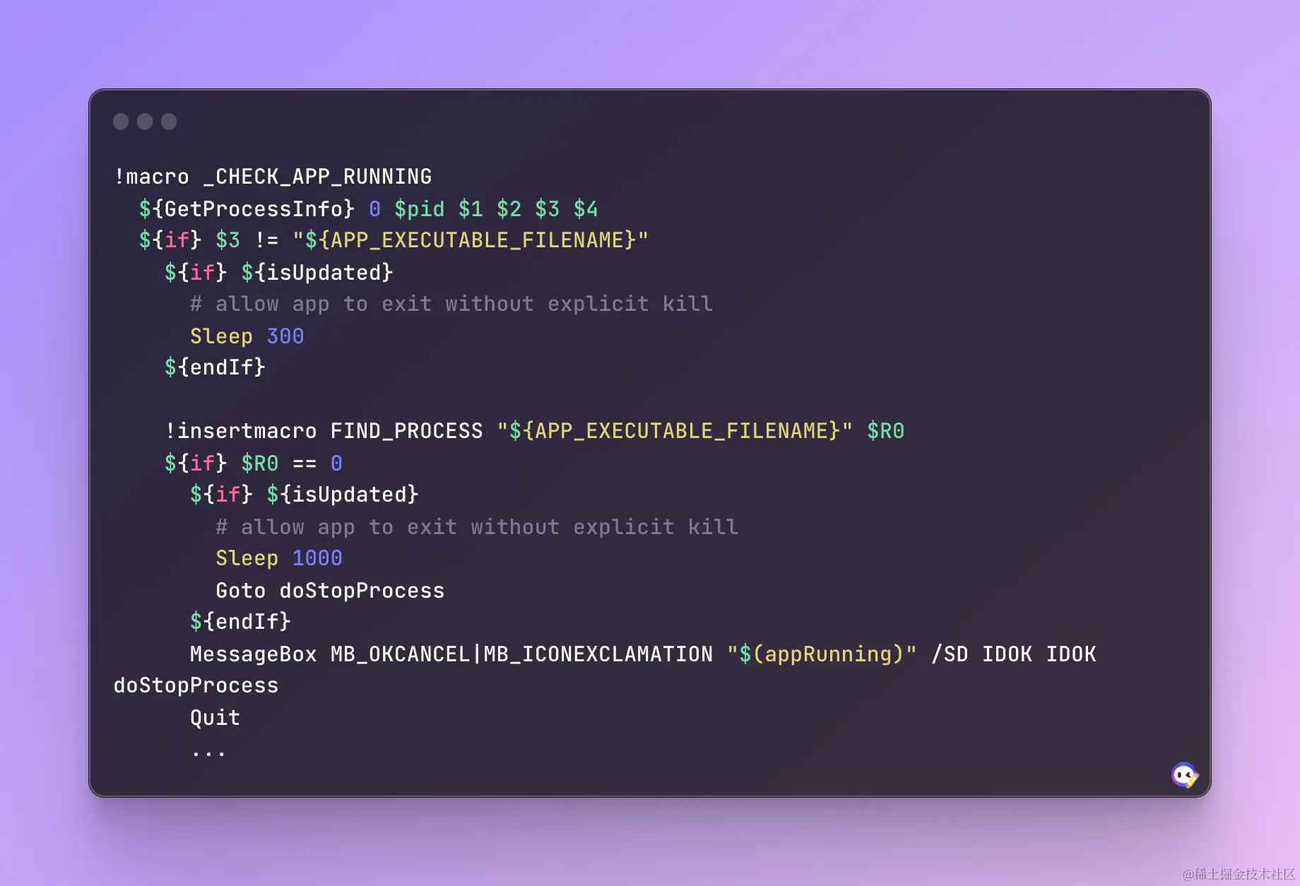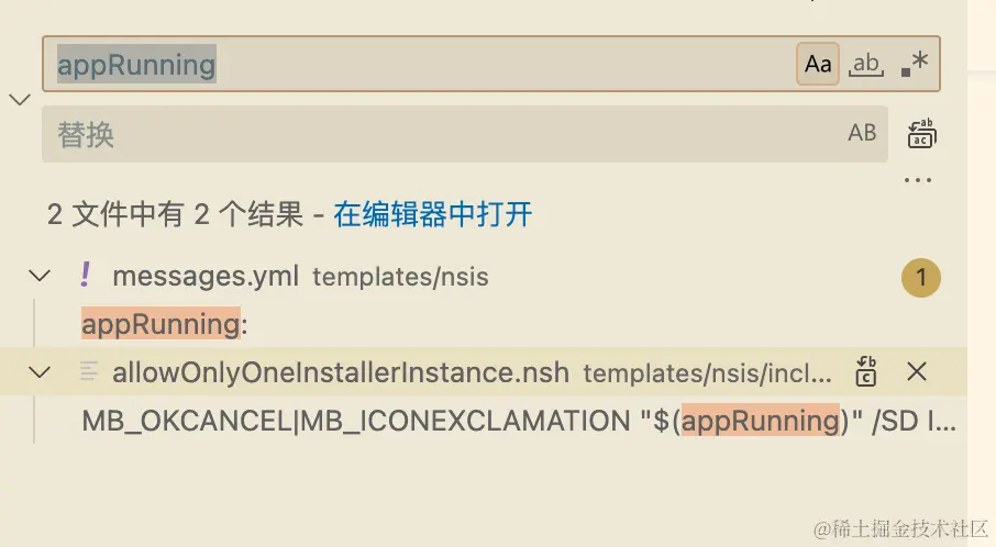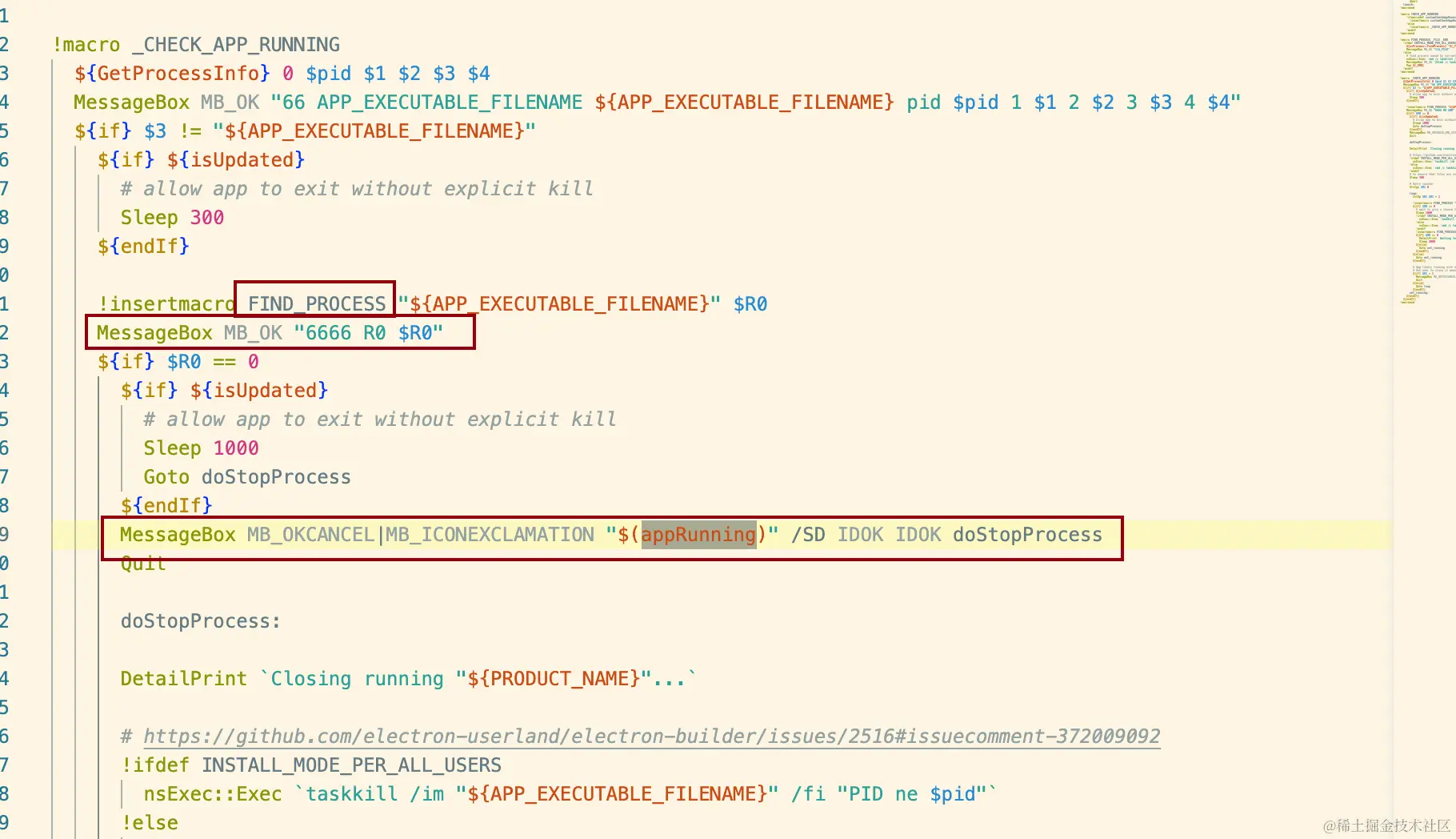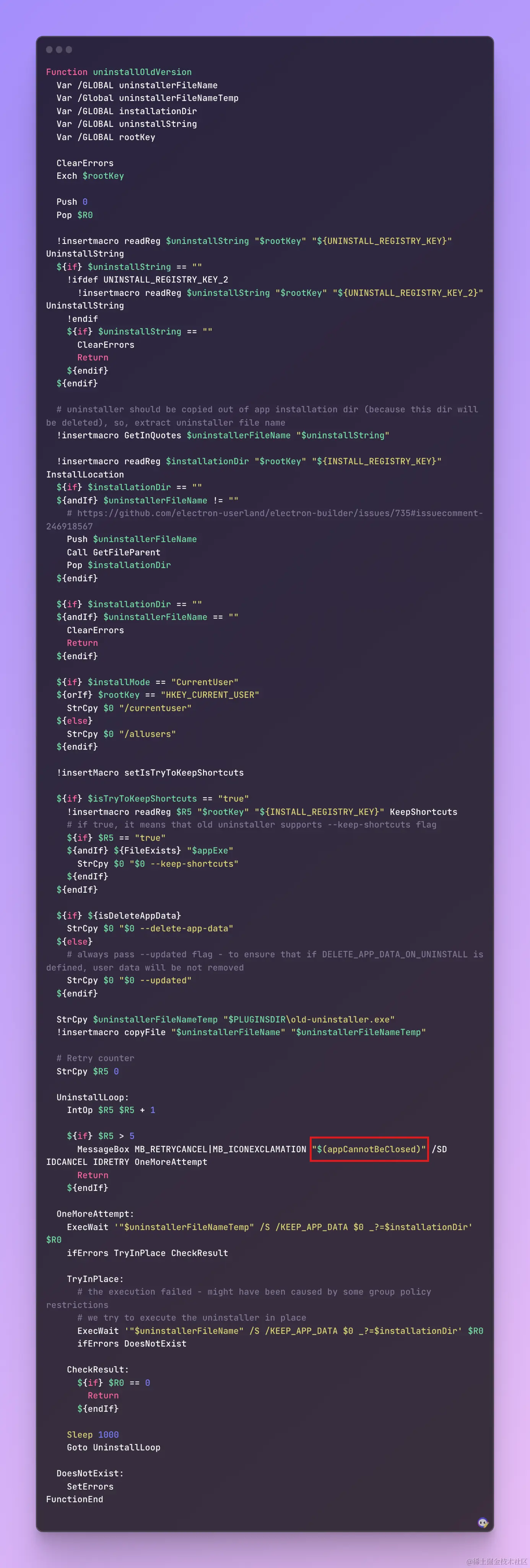 通过这个字符串,可以看到 electron-builder 编写的 NSIS 预置脚本,在这个脚本中,通过名称可以看到有一个专门用于检测程序是否有实例正在运行的宏 _CHECK_APP_RUNNING。
