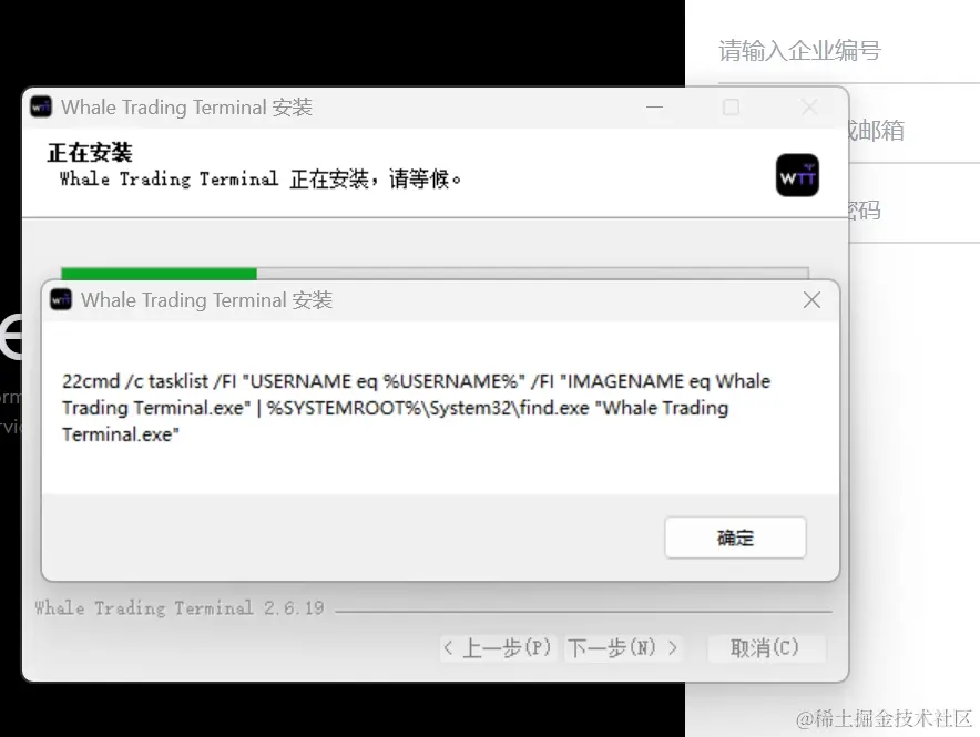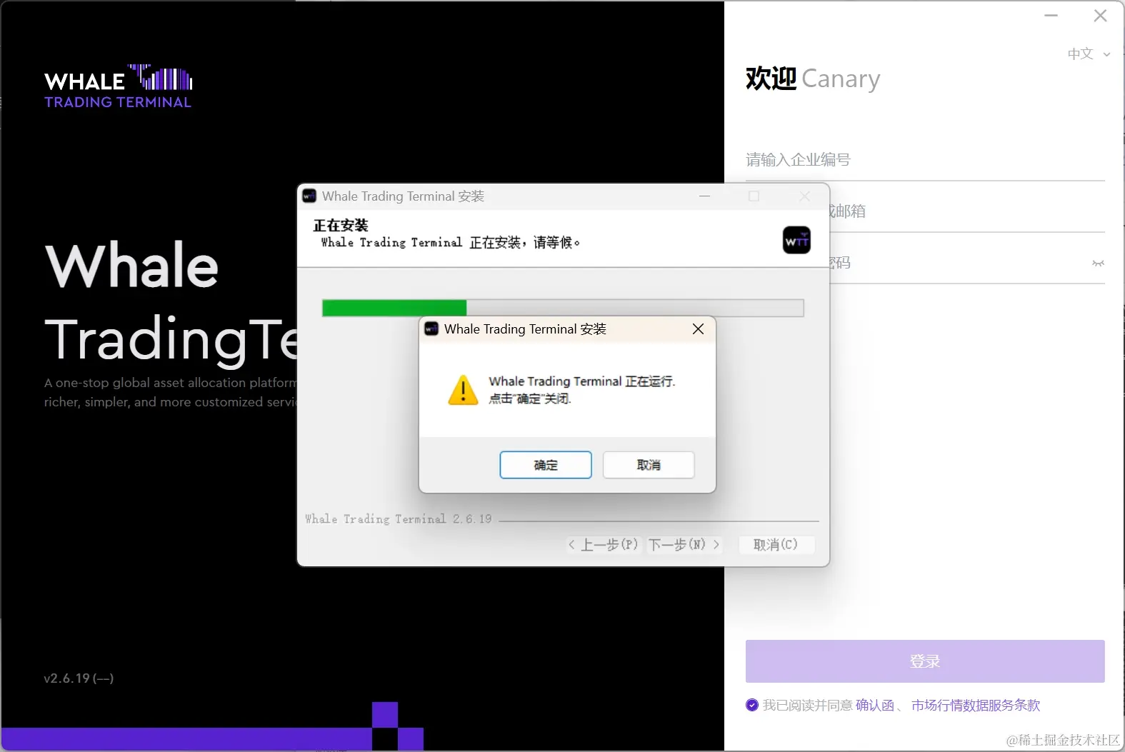 在点击确定后,更新安装程序将会正在运行的 Whale Trading Terminal 实例关闭,继续后续安装步骤。
