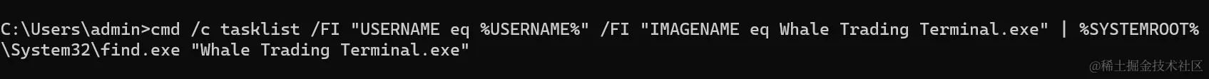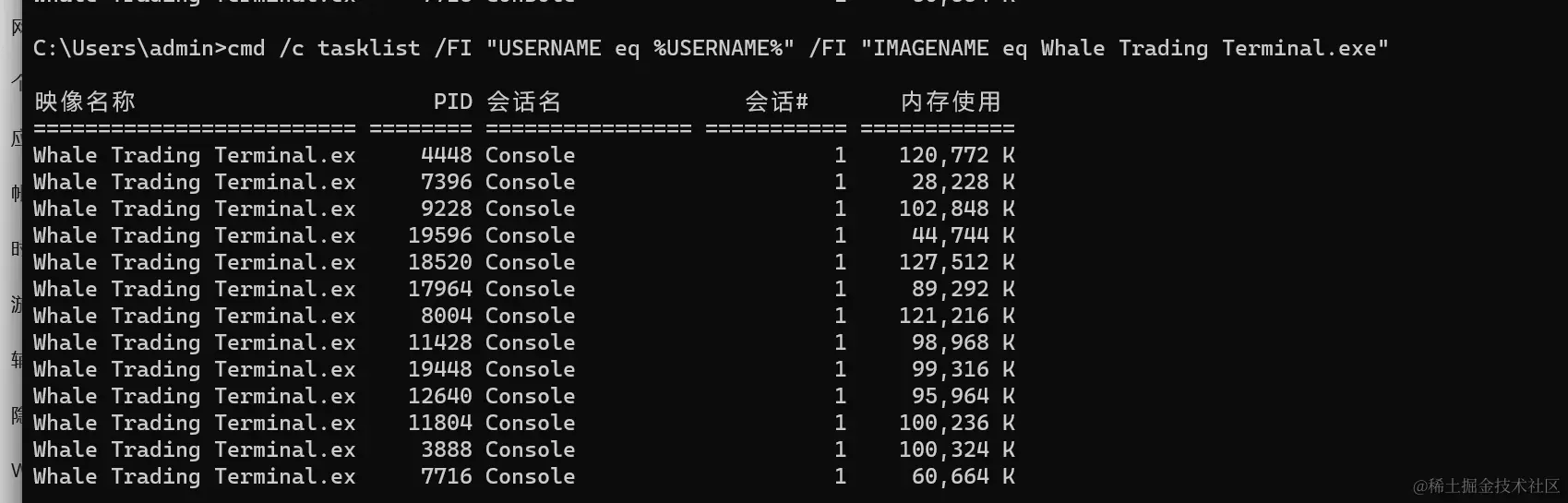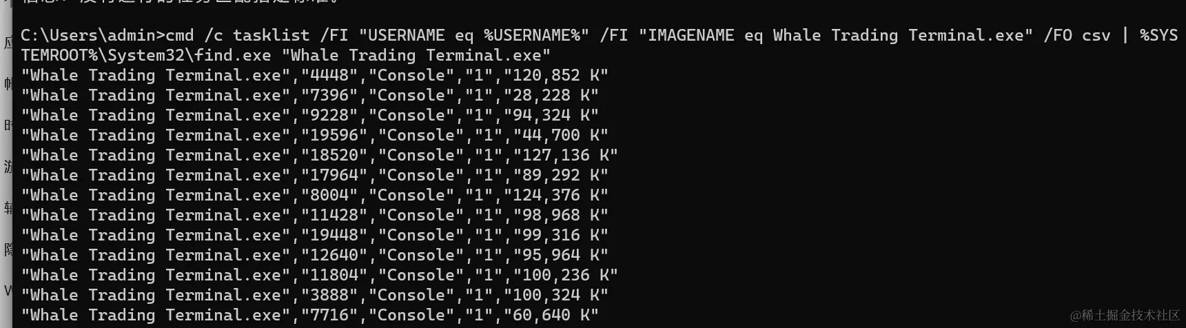 tasklist 的确列出了 Whale Trading Terminal 所有的进程列表,但是似乎有一点点不对劲,这里的映像名称是 Whale Trading Terminal.ex,相比完整的映像名称,缺少了 exe 的最后一个 e。