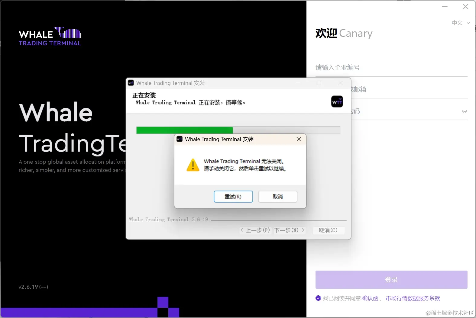 但是最近有收到用户反馈,在 Windows 系统上运行自动更新安装程序时,更新安装程序无法自动关闭当前仍在运行的 Whale Trading Terminal 实例,即使用户选择手动重试,也无法由更新安装程序完成这个操作,只能由用户主动关闭当前正在运行的 Whale Trading Terminal 才可以进行下一步操作。