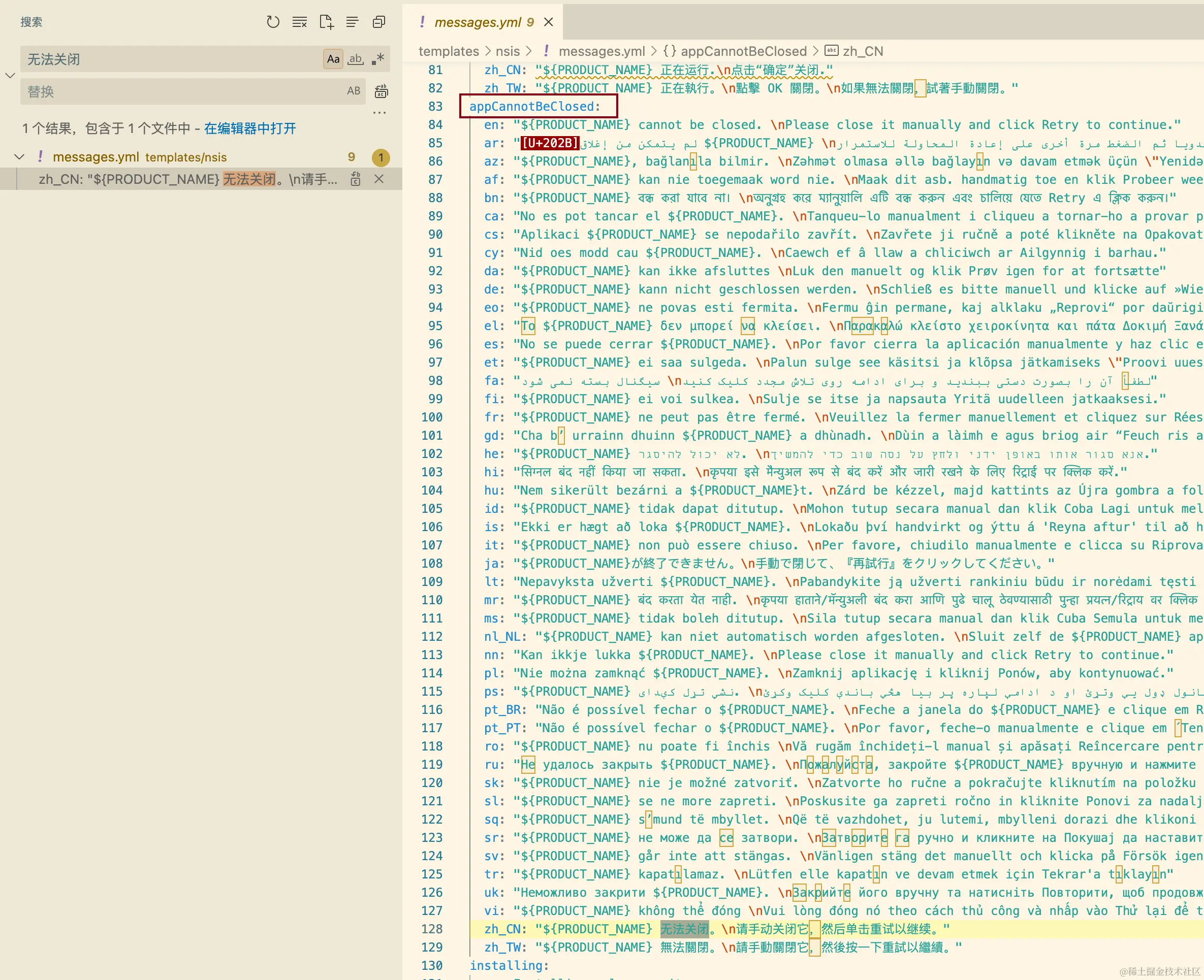再回头看为什么在 FIND_PROCESS 没有正确执行时,更新安装程序会一直提示无法关闭正在运行的程序,我们找一下 无法关闭 这个字符串,找到对应的多语言 key 为 appCannotBeClosed: