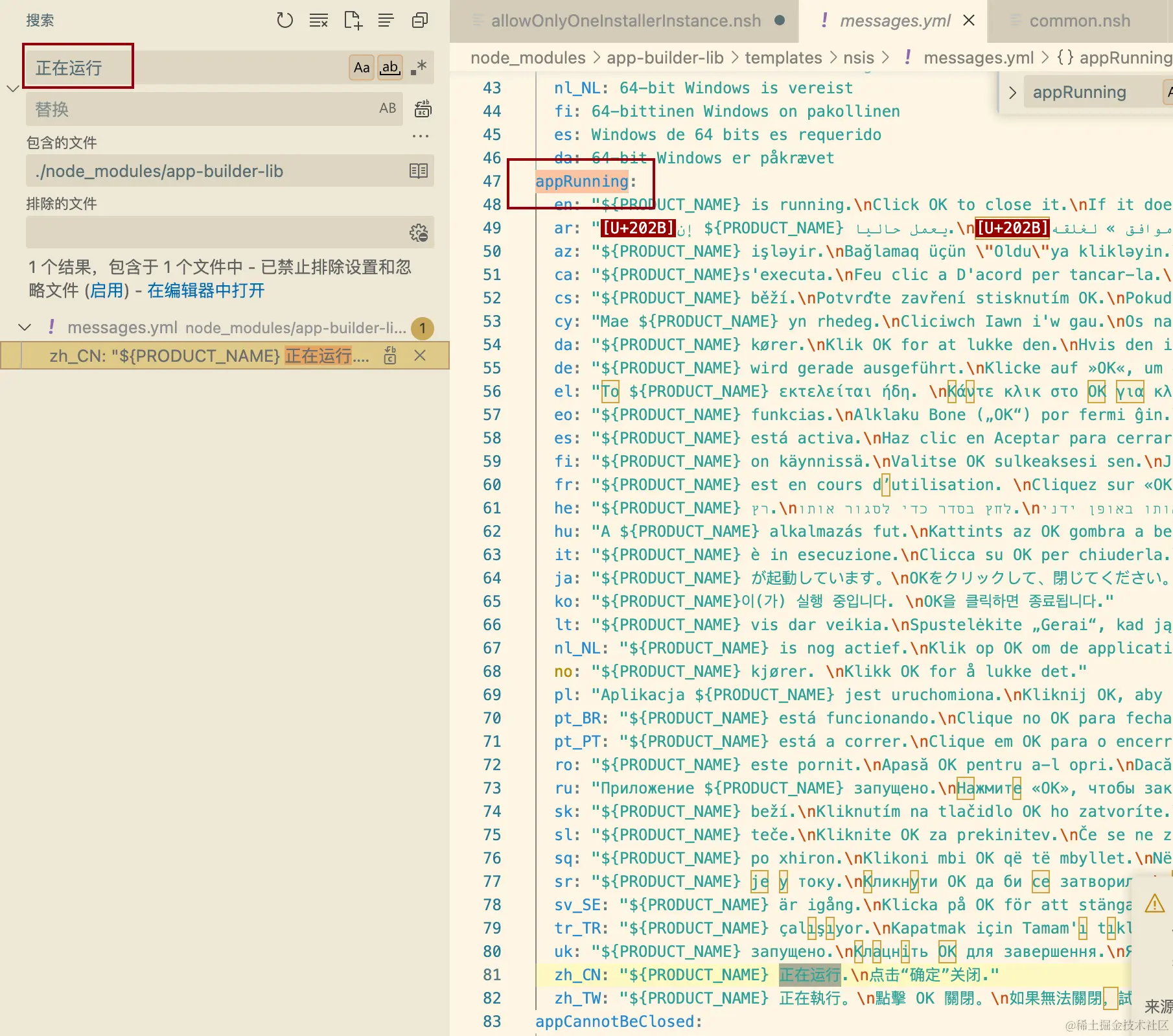 在这个多语言包中,可以看到对应这个消息提示的 key 为 appRunning,可以继续搜索这个多语言 key 在哪里使用。