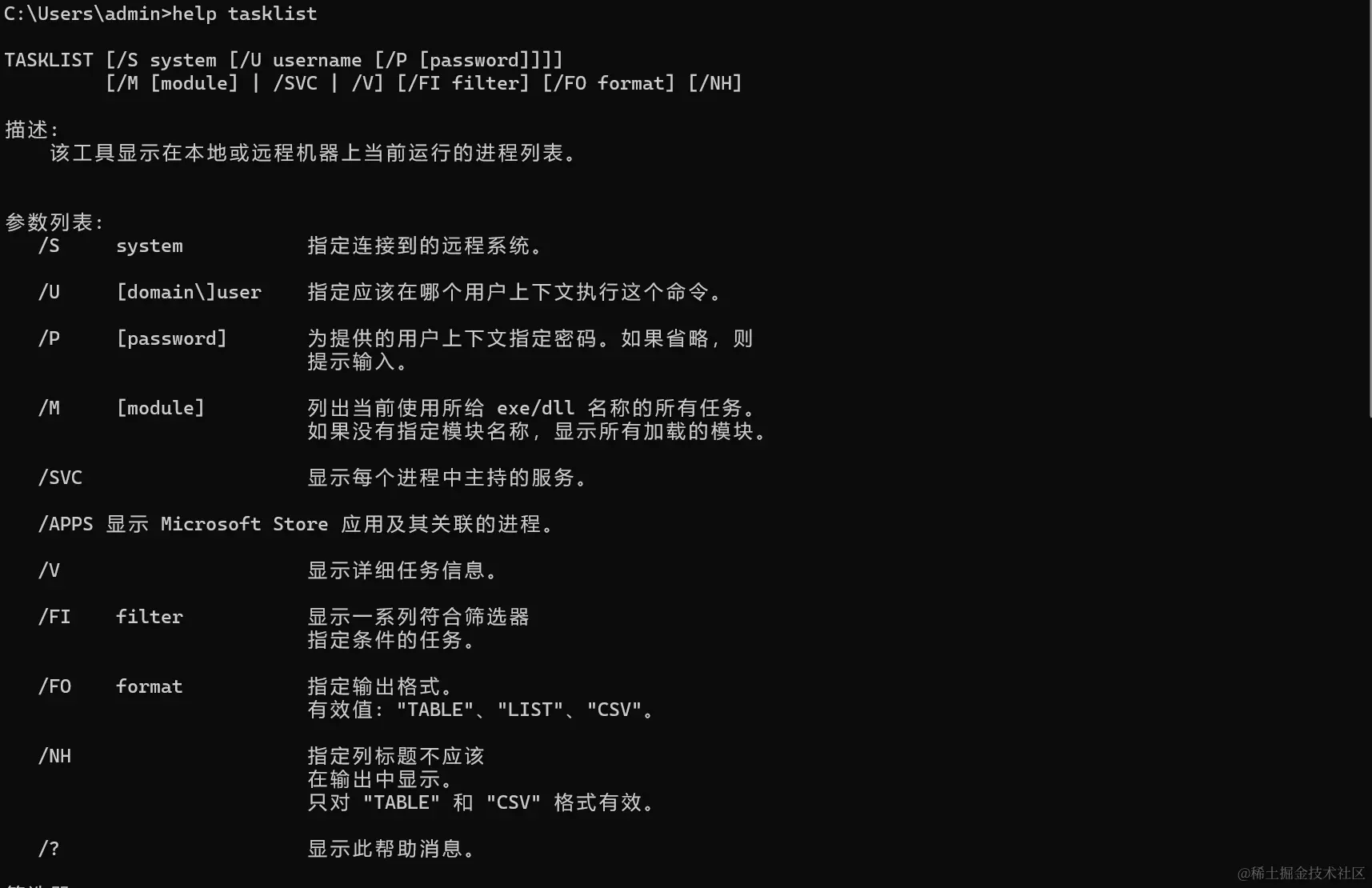 首先通过查询 tasklist 的帮忙文档,可以看到里面可以指定输出格式: