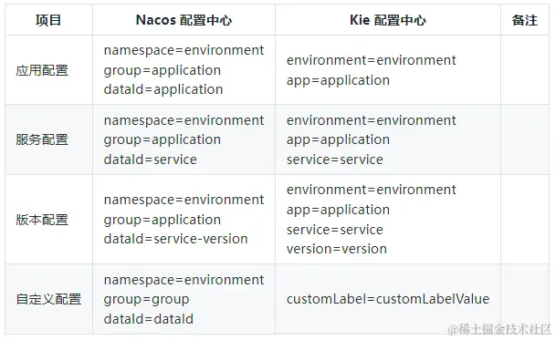 - 配置的逻辑层次。比如 Kie 提供了 Label 来表达配置的层次,可以简化为应用配置、服务配置和自定义配置等;Nacos 使用 Namespace、Group等概念来表达配置的层次。