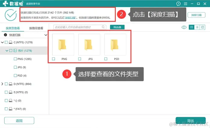 步骤2:在软件进行完首次扫描后,用户可以按照不同的路径或类型对扫描的结果进行查看,如果只找到少部分需要恢复的文件,点击【深度扫描】;