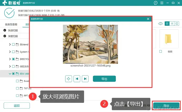 步骤3:完成深度扫描后。所呈现的数据会比较多,建议用户直接在【筛选器】中输入相关的文件条件,定位到需要恢复的文件后,图片可以方法浏览,确认是需要恢复的文件后,将其勾选上,并选择【导出】。