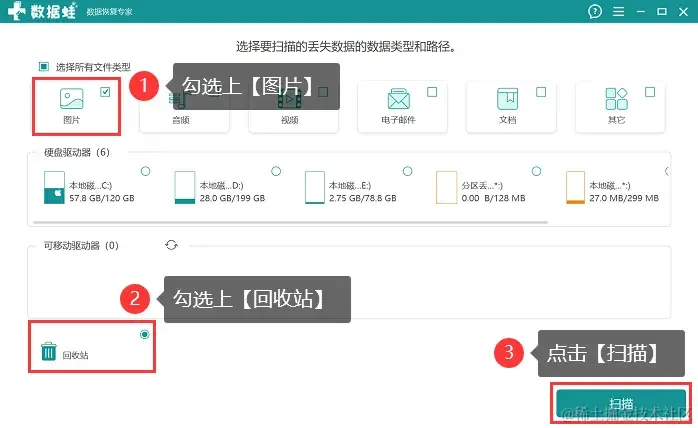 步骤1:双击运行软件后可进入选择界面,先勾选上【图片】,再勾选【回收站】 ,点击【扫描】 ;