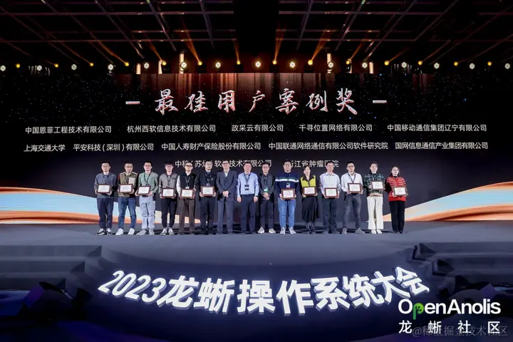 近日,在 2023 龙蜥操作系统大会上,龙蜥社区公布了 2023 年度最佳用户案例获奖企业名单,龙蜥社区副理事长张东、理事李祥凯为中国移动、小红书、中国人寿财险等 13 家获奖企业颁奖。本次获奖企业是从使用龙蜥操作系统社区版(Anolis OS)或商业版/衍生版的企业用户中进行评选,涵盖政务、互联网、医疗、通信等领域的头部企业,由龙蜥社区运营委员会、龙蜥社区技术委员会评审,并在理事会公示后评选出来。恭喜这些单位!这是龙蜥真实投入市场并服务千百行业的有力佐证,也是龙蜥将开源与商业良好结合的成果。
