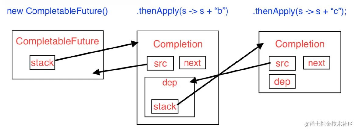 其实每次调用都会new一个Completion对象,并压入上一个CompletableFuture的stack中。所以,通常的base.thenApply(..).thenApply(..),每次调用产生的Completion并不在同一个stack中。