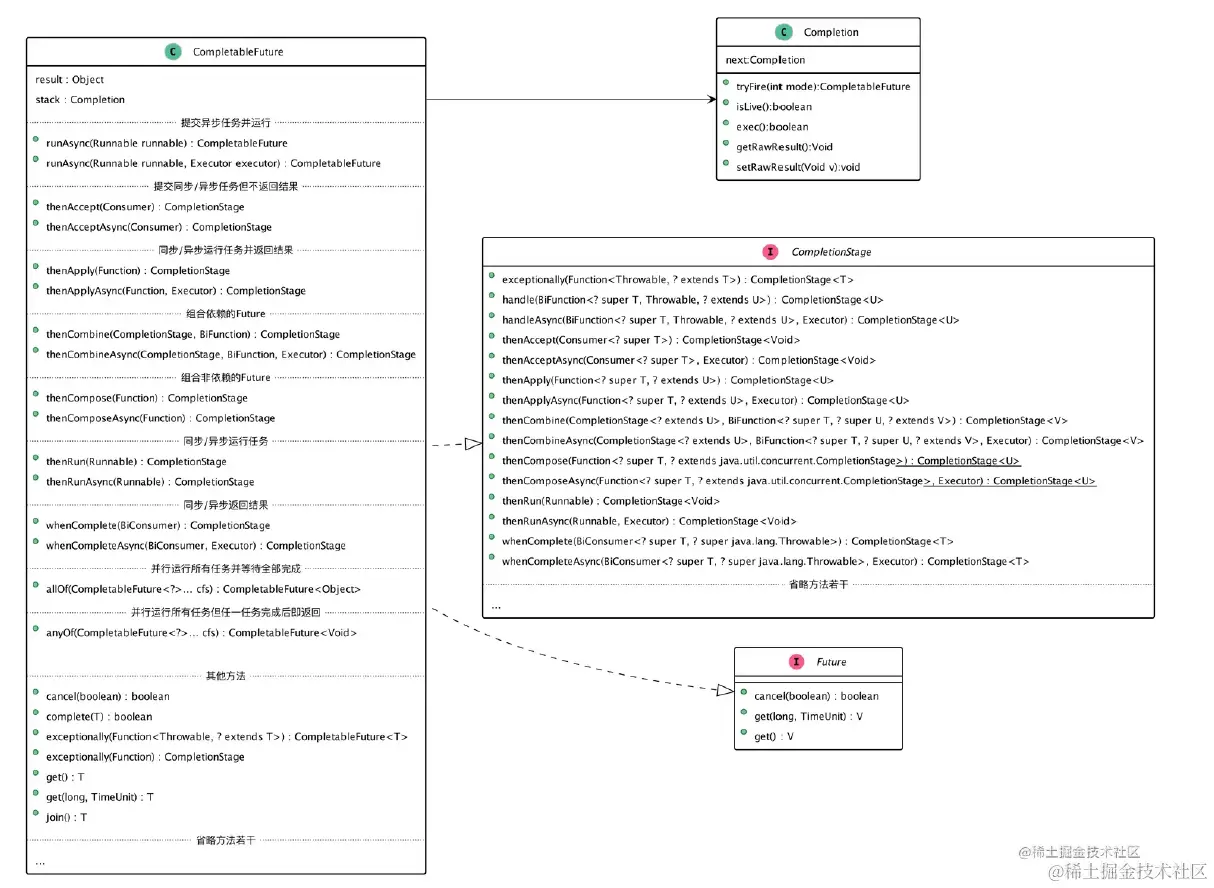 下面这幅类图,展示了CompletableFuture和Future、CompletionStage以及Completion之间的关系。