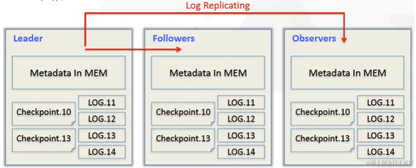 Leader、follower和 observer它们三个构成一个可靠的服务,保证单节点宕机的情况下,元数据能够实时地在线恢复,而不影响整个服务,与zookeeper角色一样。