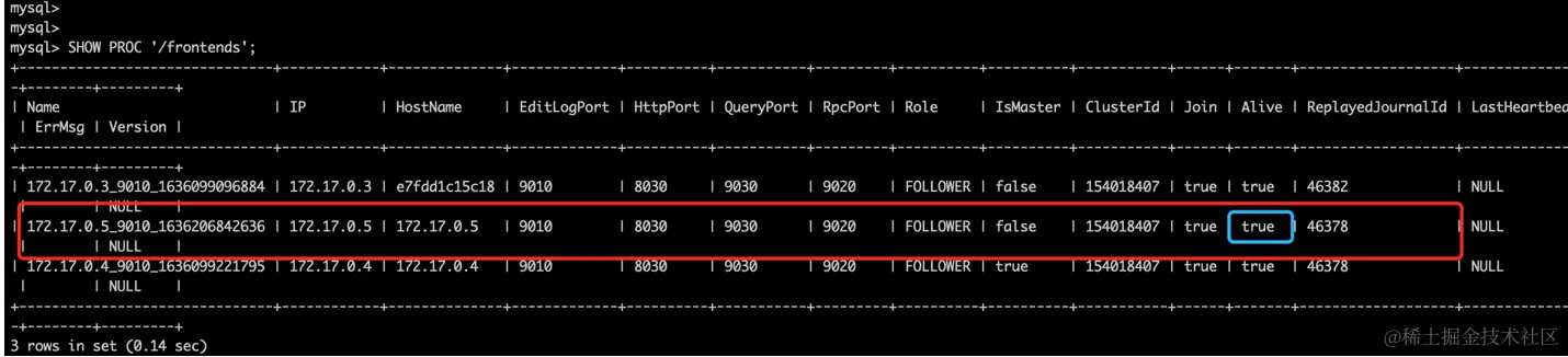 查看FE节点状态是否正常, 登录172.17.0.3服务器查看状态,执行以下命令
